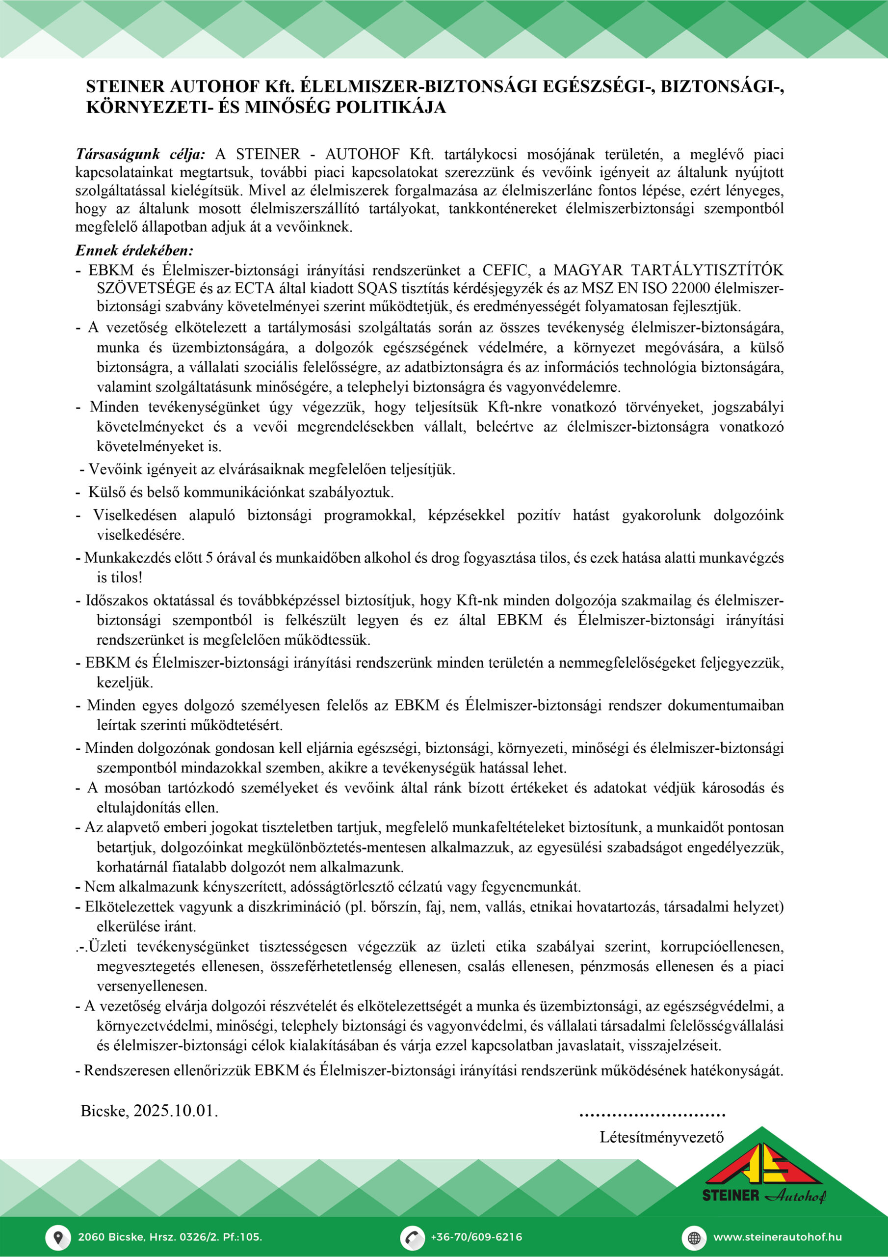 Az elvégzett tisztításról minden esetben nemzetközileg elismert ECD nyomtatványt állítunk ki. Tartálytisztításhoz alkalmazott vegyszereink OÉTI, illetve Kosher tanúsítvánnyal rendelkeznek.